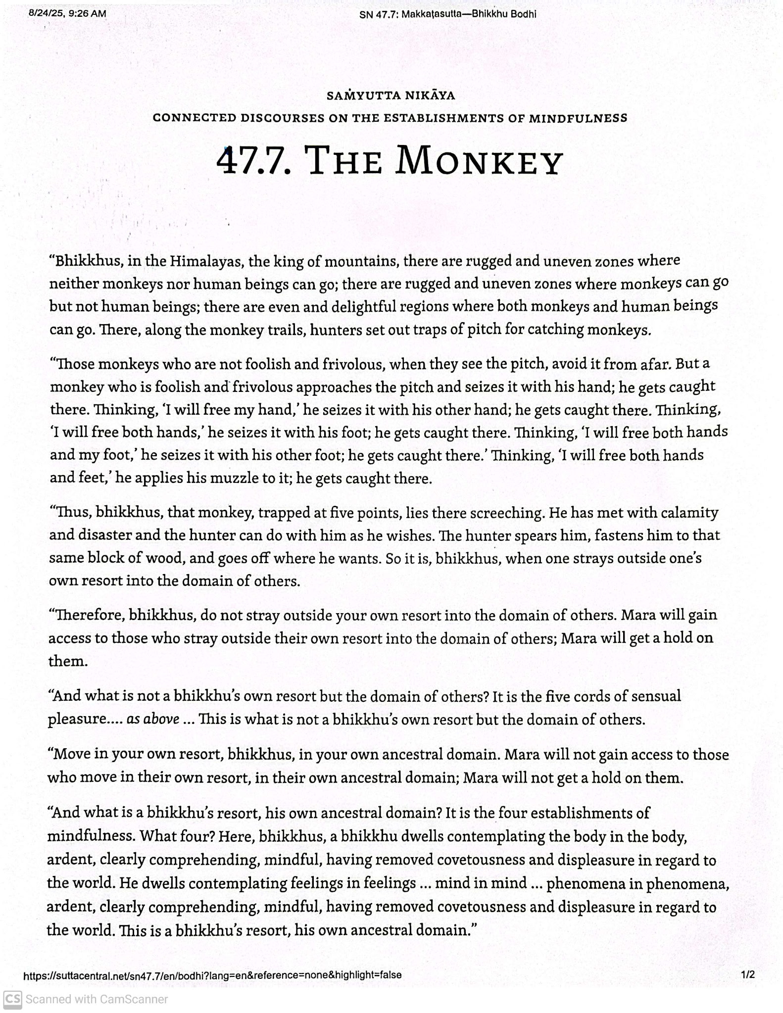 The first scan includes a discourse taught with a “monkey and pitch trap” image: when we wander into the “domain of others” (sense entanglements), we get stuck; when we stay in our “own resort,” there is freedom.