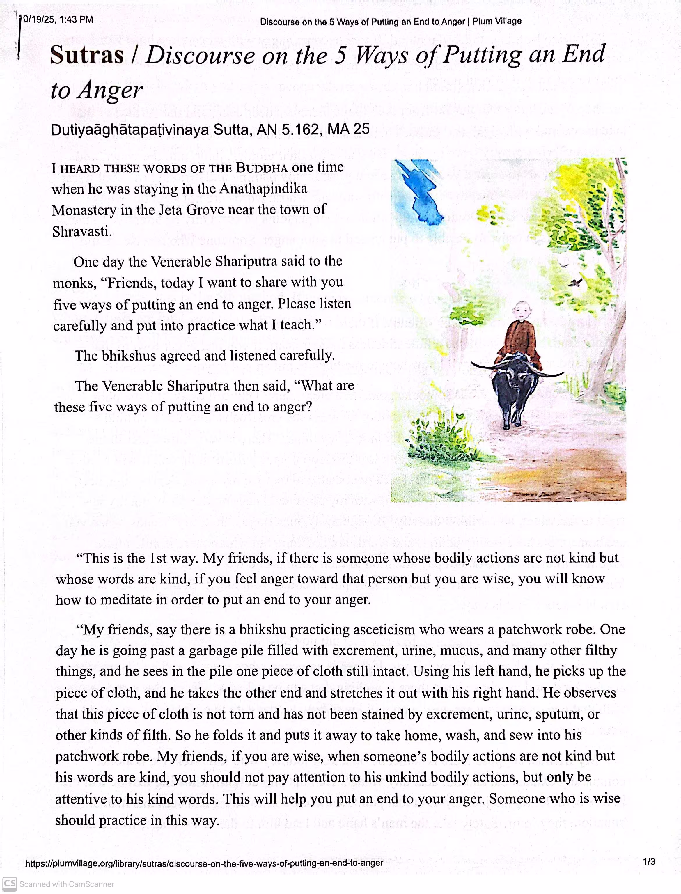 This lesson offers a practical way to work with anger in daily life: when we feel irritation toward someone, we train our attention so we don’t get trapped by reactivity. The teaching uses simple reflections and vivid metaphors (dirty cloth, algae-covered lake, buffalo footprint water, helping a sick traveler, clear lake).