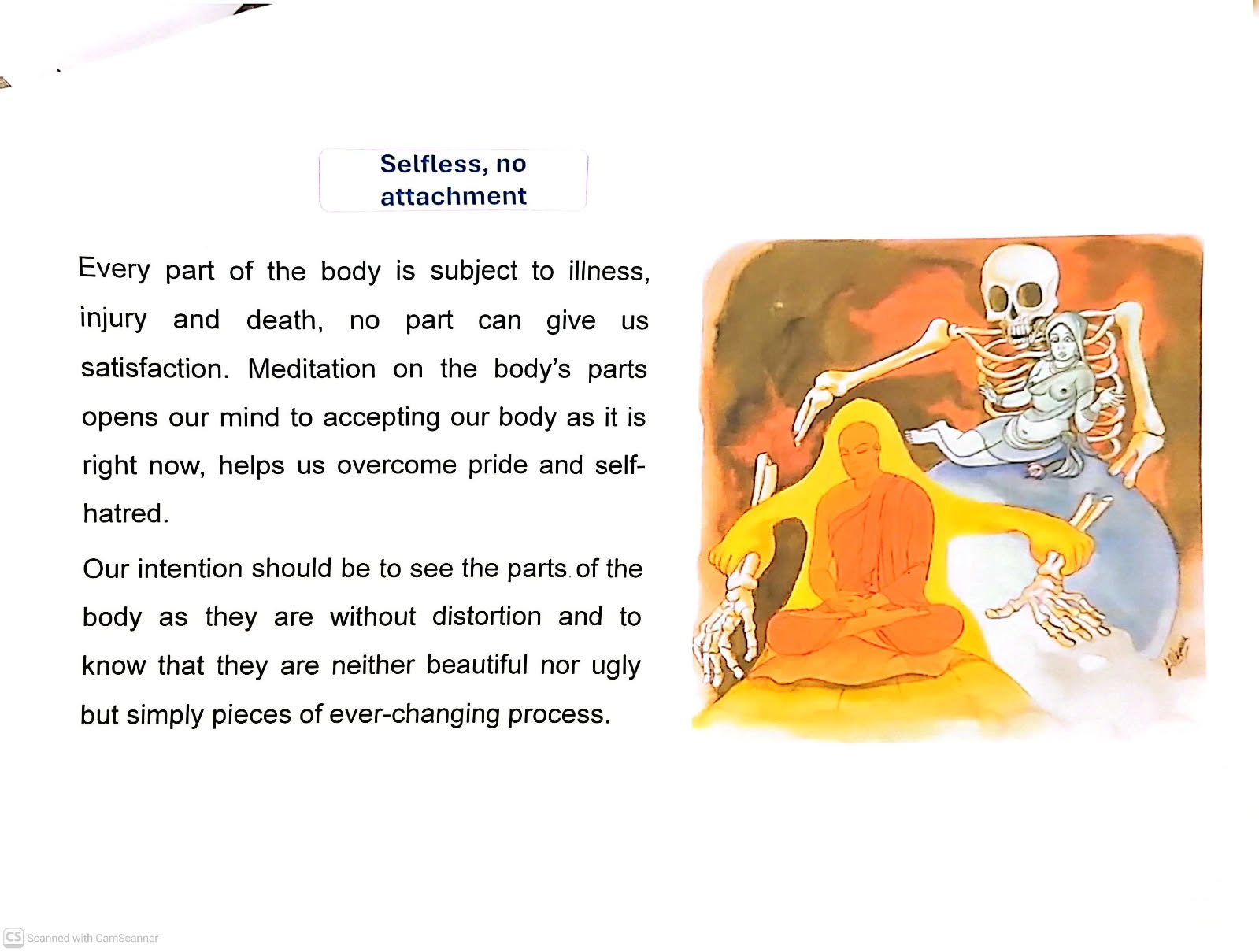 Meditation on the body’s parts is intended to help us see the body as it is—without distortion. Every part of the body is subject to illness, injury, and death, and no part can give lasting satisfaction. Practicing in this way can help us overcome pride and self-hatred, and support a mind of selflessness and non-attachment.